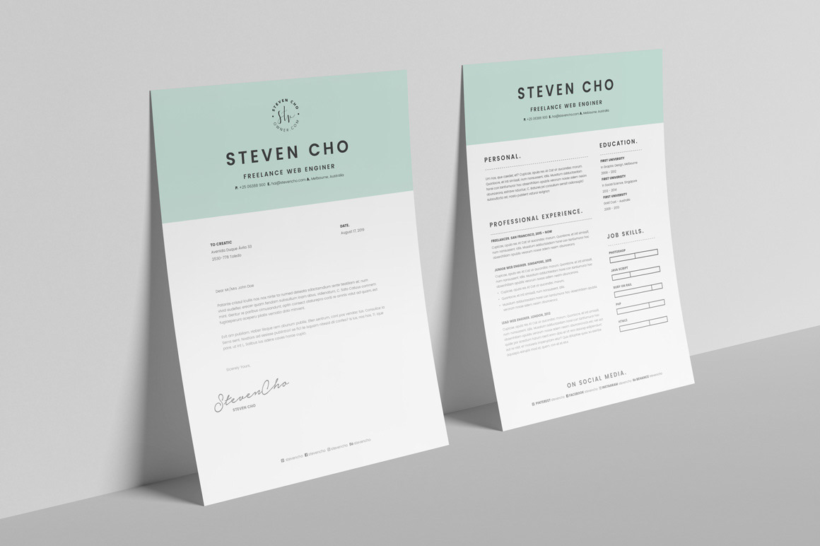 A minimalist resume and cover-letter template pack for professionals, provided in two paper sizes including US Letter and International A4. Created with Adobe InDesign and Microsoft Word