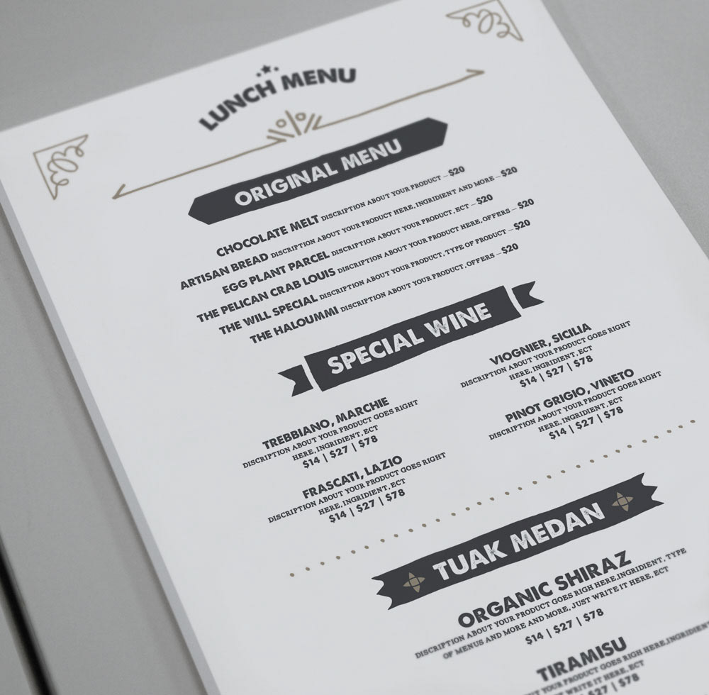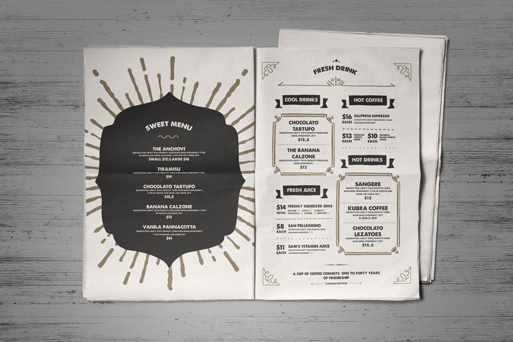 Vintage menu template, easy to customize even for the beginner. All files ready in Adobe Photoshop and Adobe Illustrator.