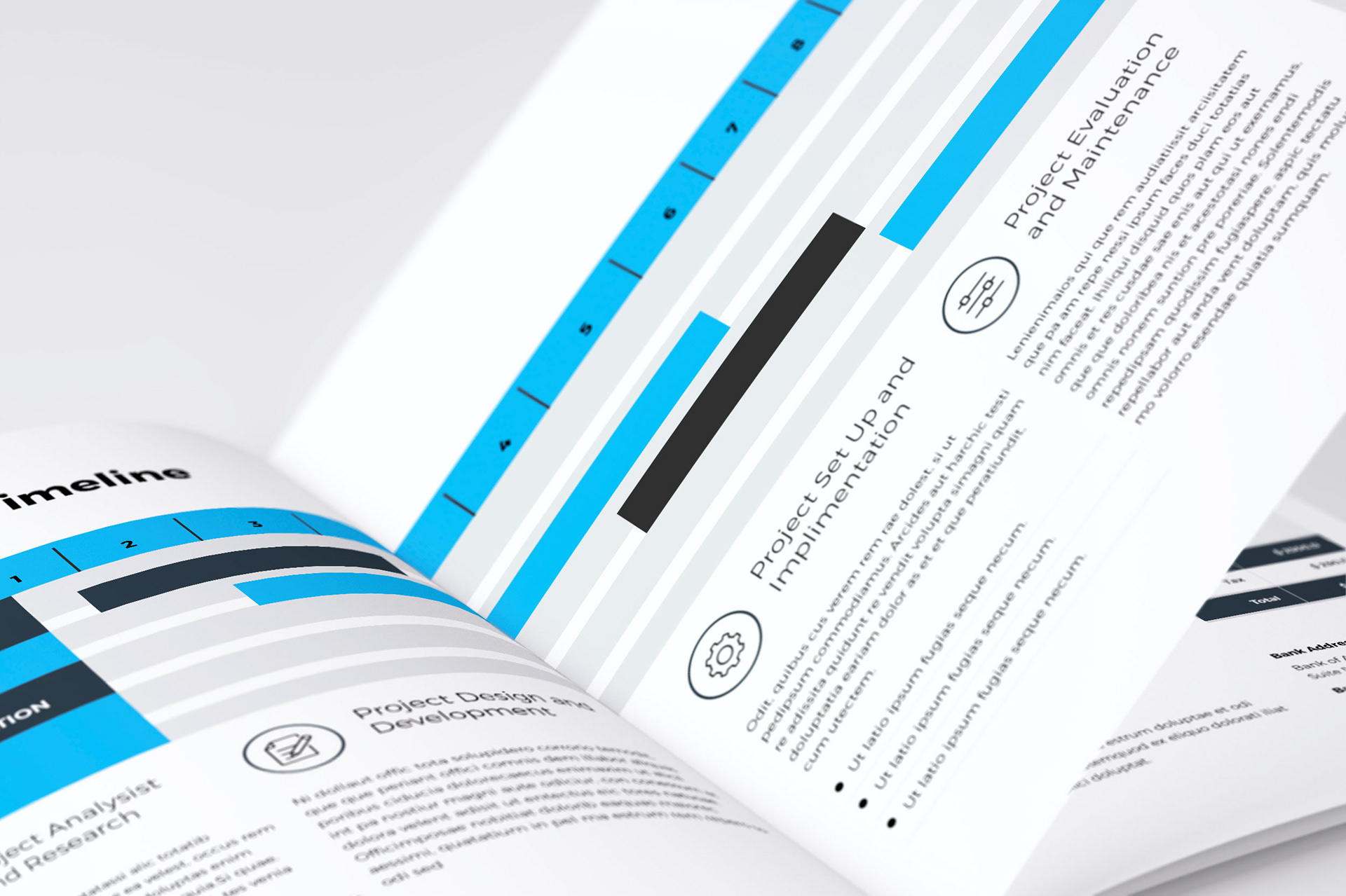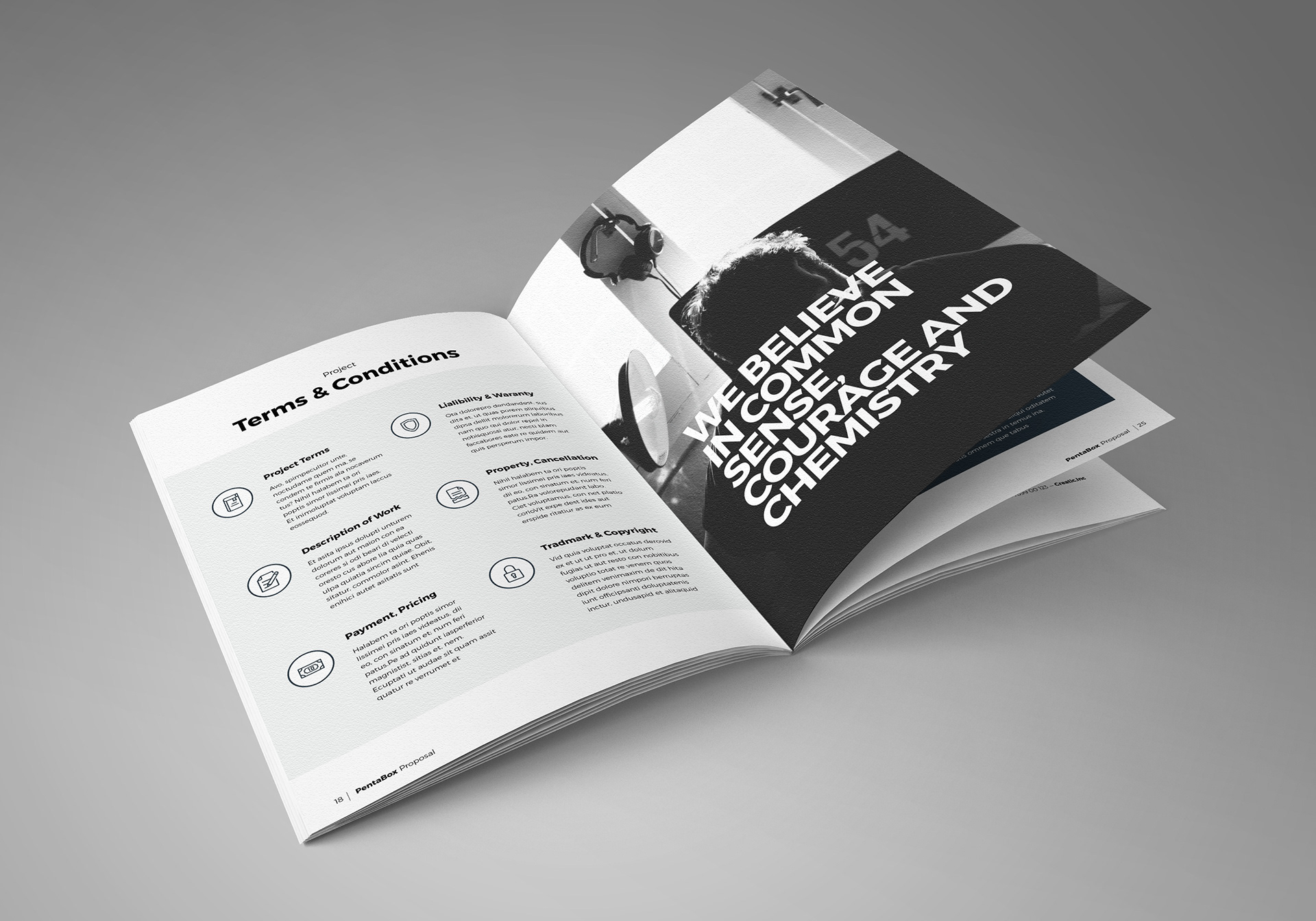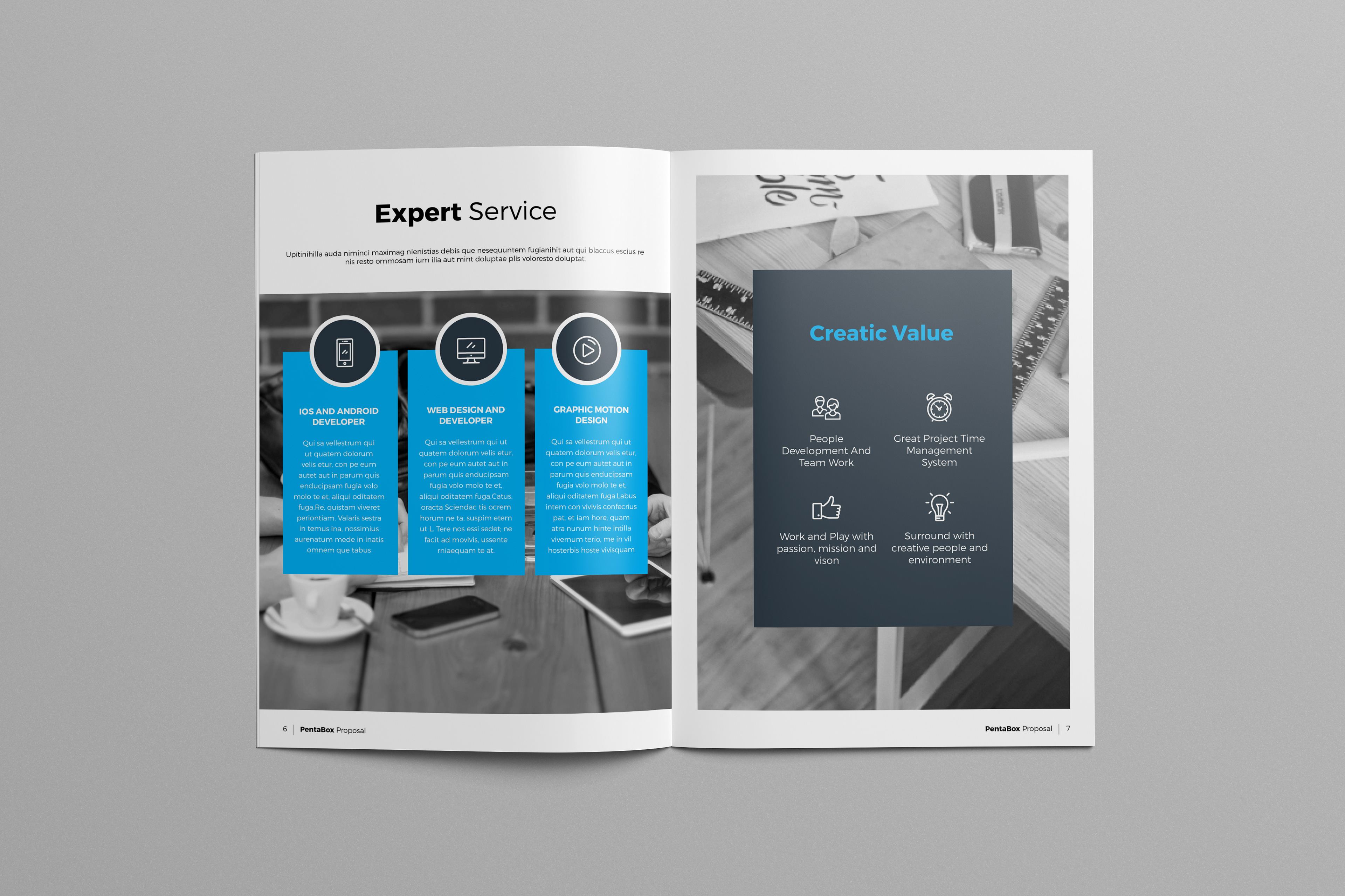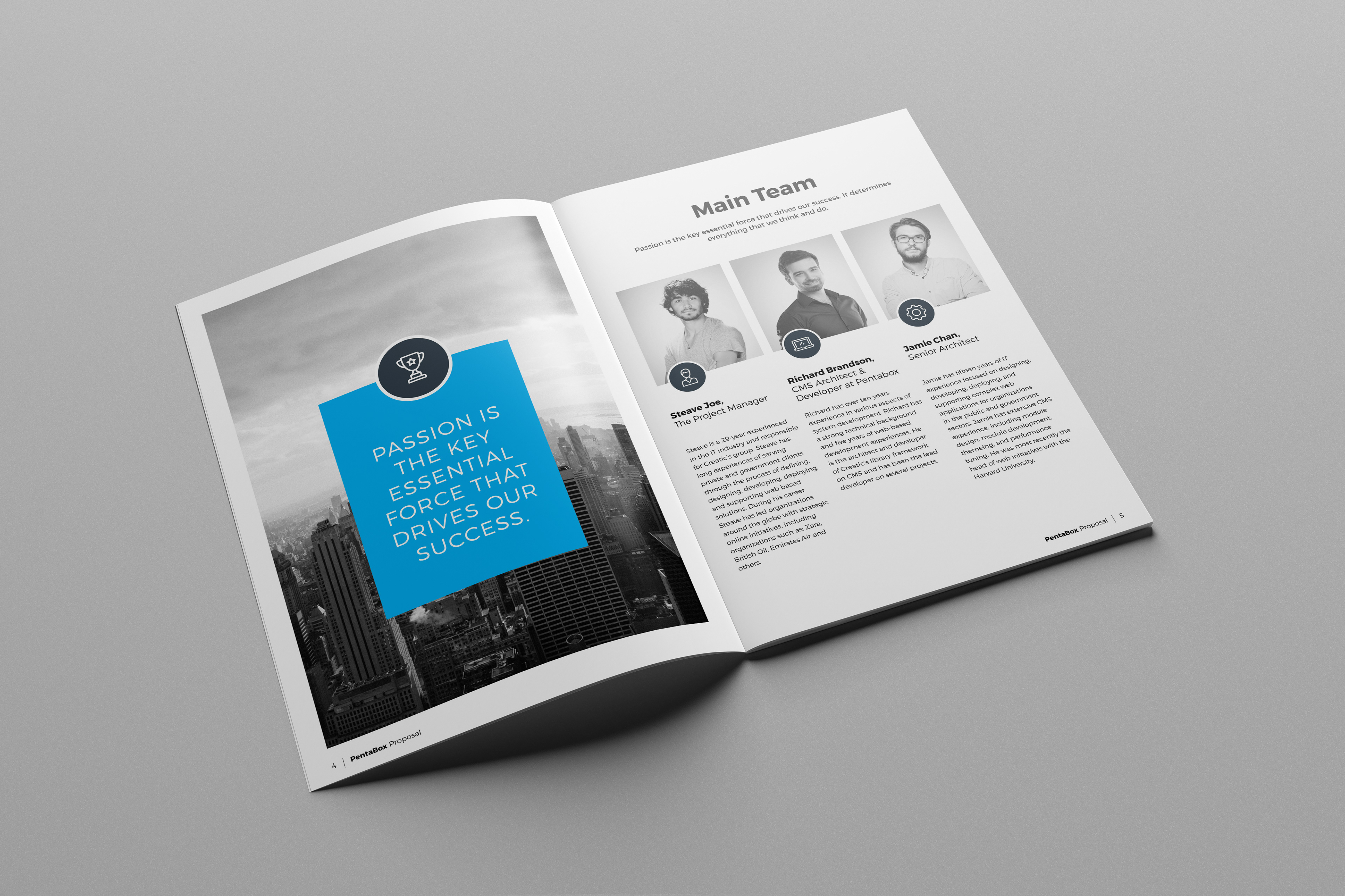 A Sharp and Professional Project Proposal template for creative businesses, created in Adobe InDesign, it comes in two paper sizes including US Letter and International A4.