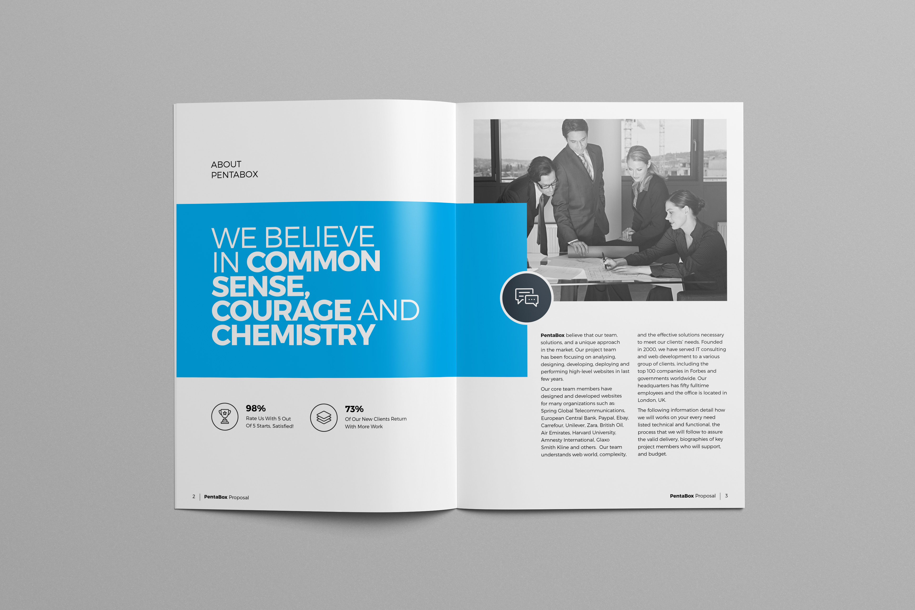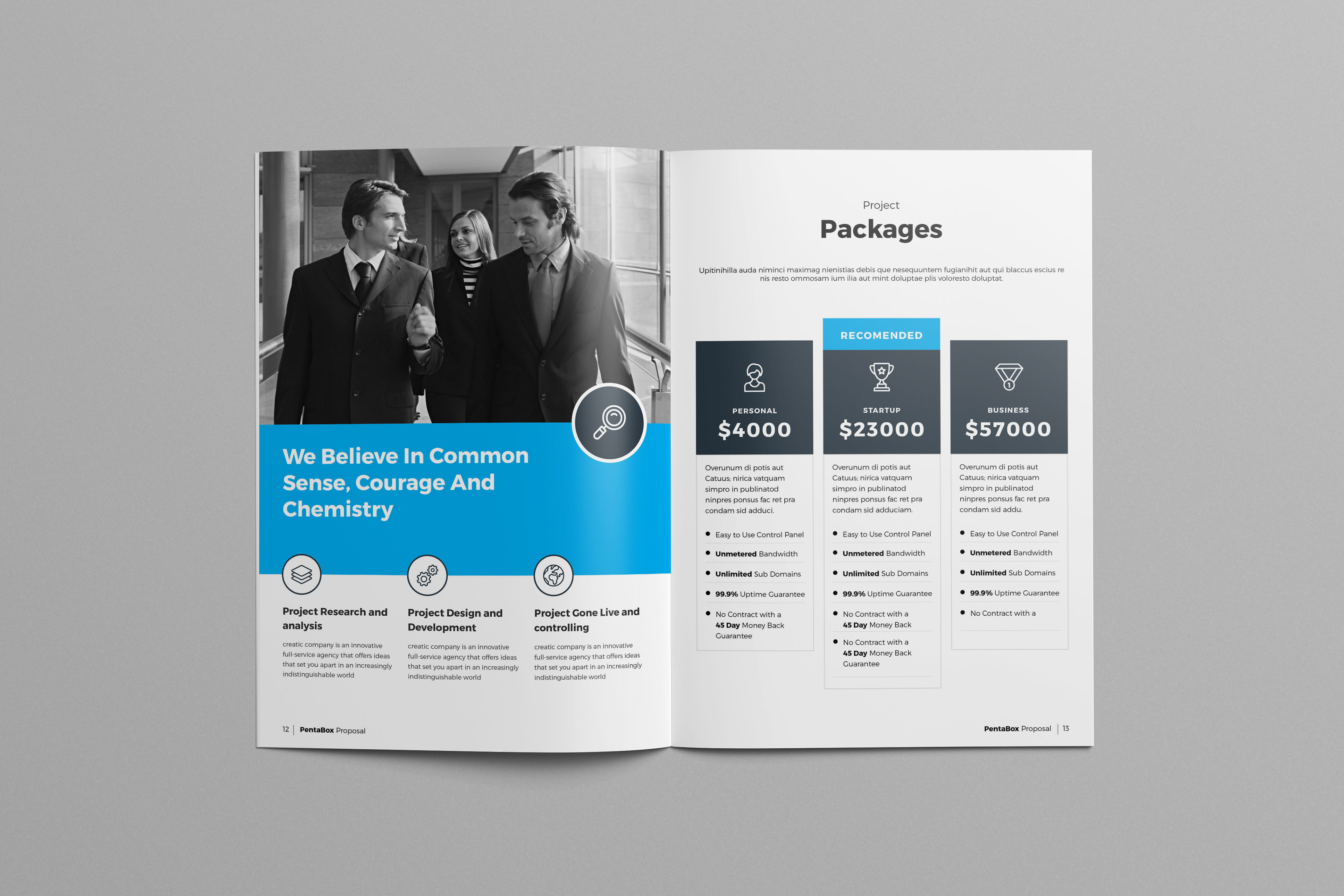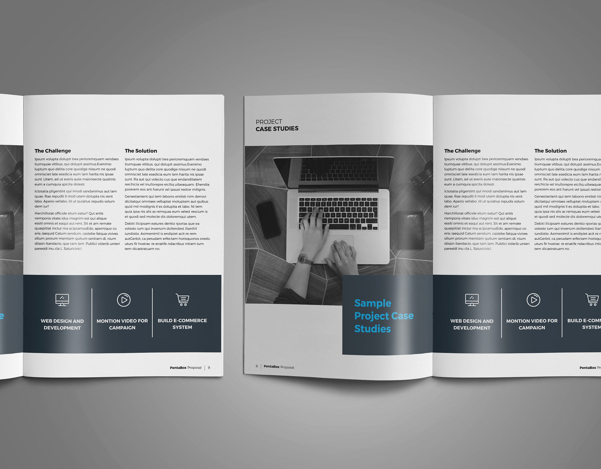 A Sharp and Professional Project Proposal template for creative businesses, created in Adobe InDesign, it comes in two paper sizes including US Letter and International A4.